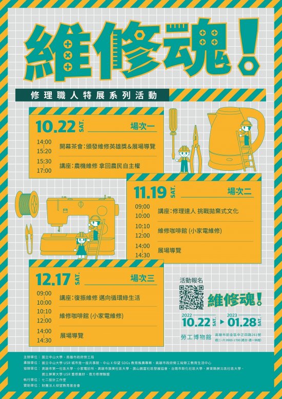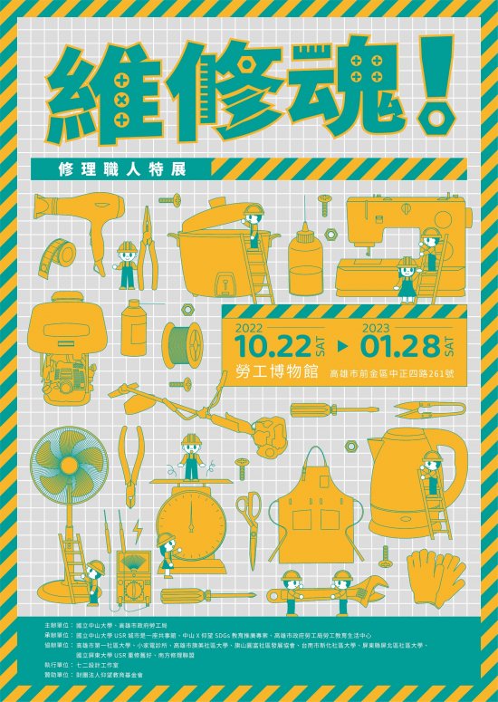 | 一、 | 本展覽於民國111年10月22日至112年1月28日假高雄市勞工博物館(高雄市前金區中正四路261號)展出,以深入淺出的方式了解維修是循環經濟的一環,與其在當代環境、經濟、社會的多重價值。 |