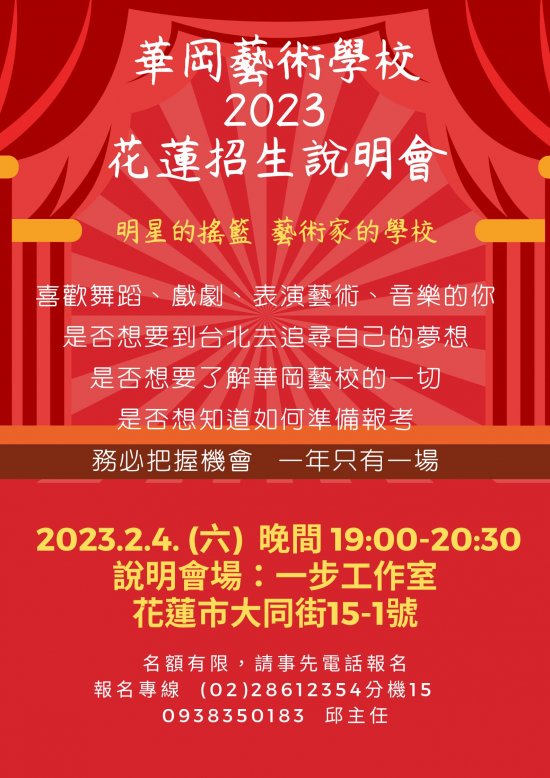 一、 臺北市私立華岡藝術學校訂於112年2月4日(六)19:00-20:30舉辦花蓮招生說明會,活動地點為一步工作室(花蓮市大同街15-1號)。