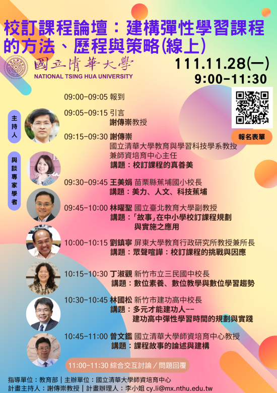 | 二、 | 旨揭線上論壇以「校訂課程:建構彈性學習課程的方法、歷程與策略」為主題,藉由專家學者,探索教育理論與實務,以能力取向、社群與批判思維深度鑽研教學知能,厚實自我生命資歷,與自我深度對話、追求卓越,成就未來的優質教育家與終身學習者。 |