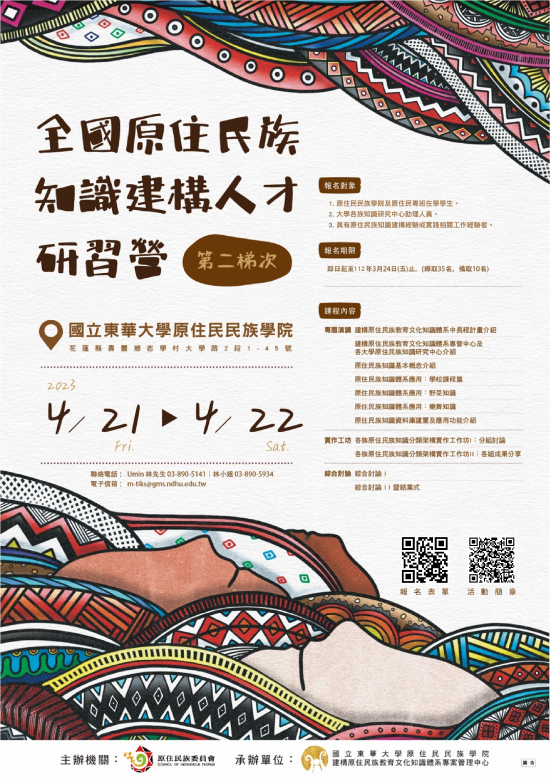 | 二、 | 旨案研習為因應原住民族發展需求,建構原住民族知識人才,以及促進原住民族知識相關議題討論,辦理此次研習營活動。 |