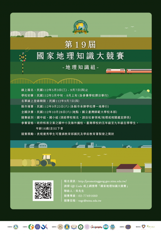 二、旨揭競賽係由教育部國民及學前教育署補助該學會辦理, 並由國立臺灣師範大學地理學系承辦,競賽項目分為「地 理知識組」與「環境觀察暨手繪地圖組」(簡稱手繪地圖 組)兩項,並均自112年5月3日(星期三)至9月7日(星期 四)可報名,相關活動訊息與報名資訊詳參附件及該競賽 網頁(http://PromotingGeog.geo.ntnu.edu.tw)。