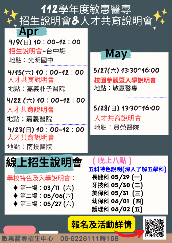 | 一、 | 本校為五專醫護類學校, 設有「護理科」、「幼兒保育科 、「美容保健科」、「牙體技術科」、「長期照顧與健康促進管理科」,為提供貴校學生及家長了解五專入學管道及升學醫護類科之未來發展。 |