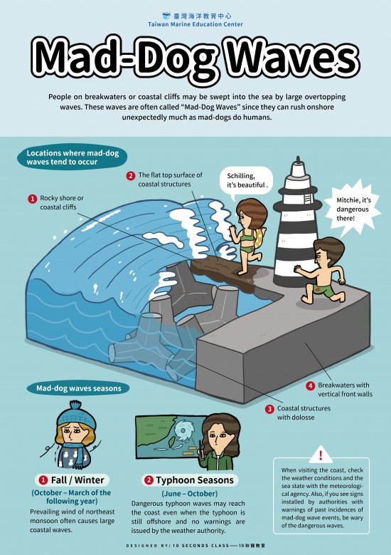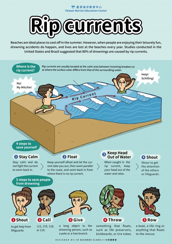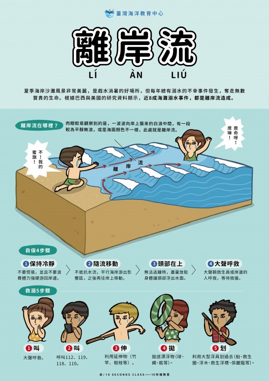二、有鑑於「離岸流」及「瘋狗浪」為造成海域遊憩事故之兩 大主因,本中心以中英文雙語製作「離岸流」與「瘋狗 浪」主題之海報與動畫,將相關資源整合至網址: https://tmec.ntou.edu.tw/p/406-1016-38947,r625.php? Lang=zh-tw,此專頁亦以「【資訊公告】海洋防災科普宣 導資源,歡迎大眾踴躍分享。」標題,於本中心網站公告 欄輪播,敬請貴校向師生宣導,盼能減少相關海域遊憩事 故。