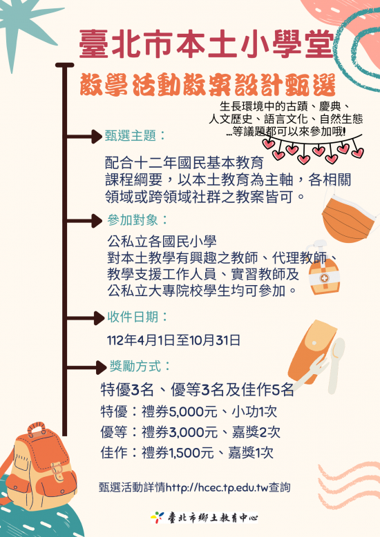 | (三) | 收件日期:112年10月31日(星期二)前將作品3份註明「臺北市本土小學堂—教學活動教案甄選」,掛號郵寄送達臺北市鄉土教育中心或公文聯絡箱送達(056老松國小)及電子檔傳送報名(hcec.tp@msa.hinet.net)。 |