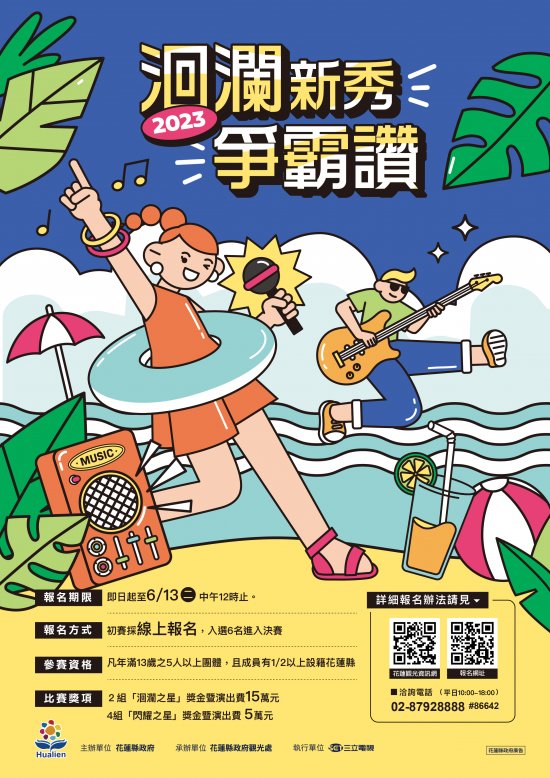 六、請貴單位協助張貼海報、更新網頁最新訊息、發布FB粉絲 專頁宣傳「2023洄瀾新秀爭霸讚」徵選活動,宣傳期間為 即日起至6月13日中午12時止,敬請宣傳週知。
