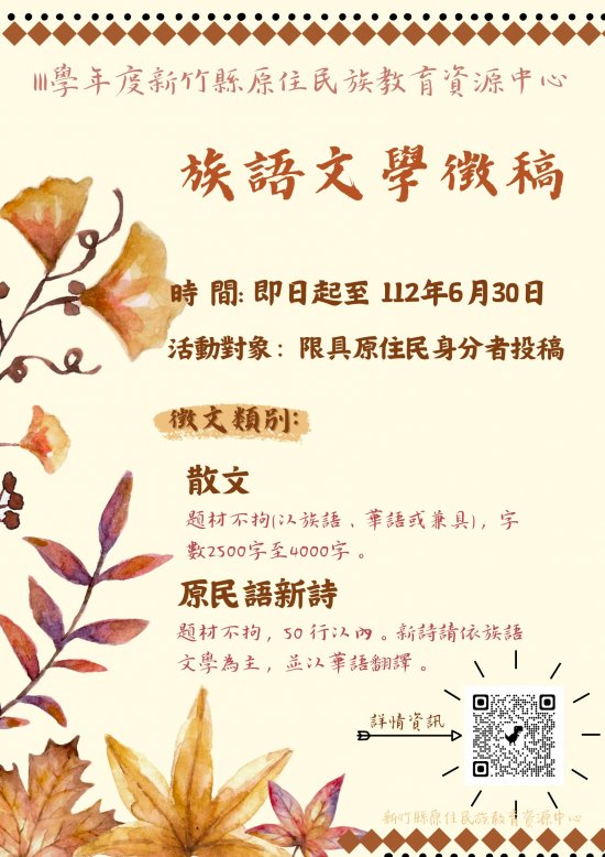 | 2、 | 原民語新詩:題材不拘,50 行以內。新詩請依族語文學為主,並以華語翻譯。 |