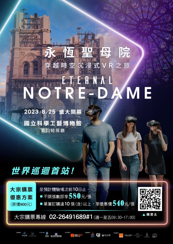 | 一、 | 法國指標性的哥德式建築,同時也是寶貴的文化藝術資產「巴黎聖母院」於2019年4月慘遭祝融,重建計畫受到全球矚目及支持,除了建築本身的修建外,法國電信商Orange與天主教巴黎總教區、巴黎市政府合作打造以融合VR科技的沉浸式體驗《永恆聖母院》來重現巴黎聖母院的歷史與藝術價值,也被視為科技復興世界文化遺產的重要里程碑。如此別具歷史意義的VR體驗在HTC、VIVE Arts策畫、本公司執行的共同合作下,引進台灣作為海外巡迴首站。《永恆聖母院》是一趟穿越時空的沉浸式數位旅行,觀眾來到《永恆聖母院》的展覽現場,建立一個虛擬分身之後,僅須配戴VR頭顯裝置及背包,就可以在虛擬導遊的引領下,飛越國界直達法國,重回十二世紀巴黎聖母院開始建造的最初時刻。深入建築內部,以360度全方位近距離觀賞末日審判之門、祭壇、拱頂、玫瑰花窗、管風琴等精湛絕美的建築元素;最後跟著升降梯登上69公尺高的鐘塔,在巨鐘的底下感受多具銅鐘齊響的震撼。還能走出塔樓到戶外,以絕佳的視野俯瞰瞭望大文豪雨果筆下的巴黎世界,並重回2019年燒毀前屋頂尖塔的火災現場,向世人展示正如火如荼進行中的修復計畫。全長共45分鐘的VR走動式體驗,《永恆聖母院》將提供學生們一個既有趣又教育性的嶄新體驗,有助於拓寬國際藝文視野及對於元宇宙、虛擬實境科技的認識。 |