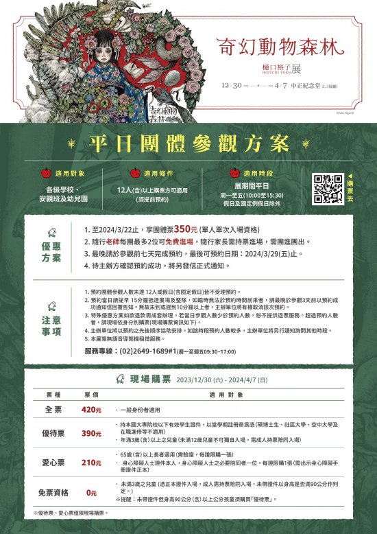 | (二) | 適用條件:12人(含)以上購票,可另提供隨行老師最多2位免費進場,隨行家長需持票進場。 |