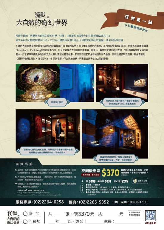 | (一) | 「怪獸與大自然的奇幻世界」特展,將大英自然史博物館領先全球的珍貴館藏,與《哈利波特》與《怪獸與牠們的產地》系列電影中的出現的道具、兩套系列書籍出版社Bloomsbury Publishing的原創藝術作品,以及受到魔法世界啟發的模型等一同展示。觀眾有機會沉浸在奇幻世界、大自然與科學所交織的氛圍中,發現到傳說中的生物及令人無法自拔的魔法故事,都是受到現實世界的大自然所啟發;同時也將了解受到廣大粉絲喜愛的《怪獸與牠們的產地》和《哈利波特》系列電影中,所出現的奇獸與現實自然界生物之間的聯繫。 |