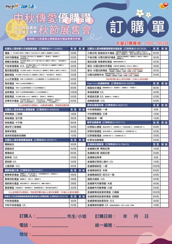 | 二、 | 隨函檢附雲林縣優先採購身心障礙福利機構團體暨庇護工場生產物品及服務中秋節禮盒訂購單張各1份,請逕洽各身障機構團體或至「衛生福利部秋節產品聯合推廣活動網站」(https://reurl.cc/Re1GVe)瀏覽選購,支持身心障礙者就業機會。 |