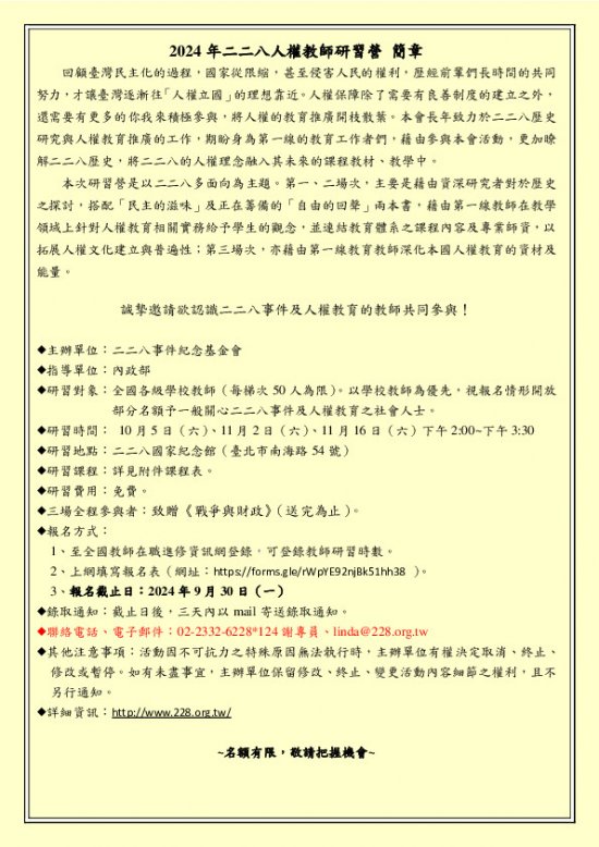 | 三、 | 承上述,將於今年10月5日(星期六)、11月2日(星期六)及11月16日(星期六)假二二八國家紀念館舉辦「2024年人權教師研習營」活動,鼓勵各級學校教師參與。 |