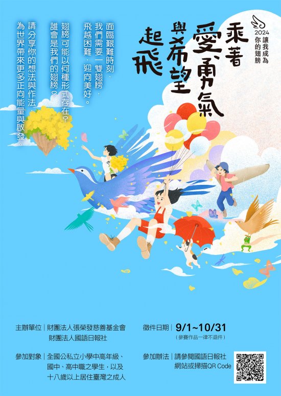 一、 本社與張榮發慈善基金會合辦「2024讓我成為你的翅膀──乘著愛、勇氣與希望起飛」徵件活動,海報QR Code誤植,特此更正。