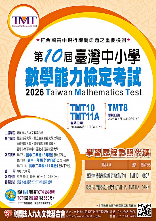 • 第十屆臺灣中小學數學能力檢定考試(Taiwan Mathematics Test, TMT)函文.pdf