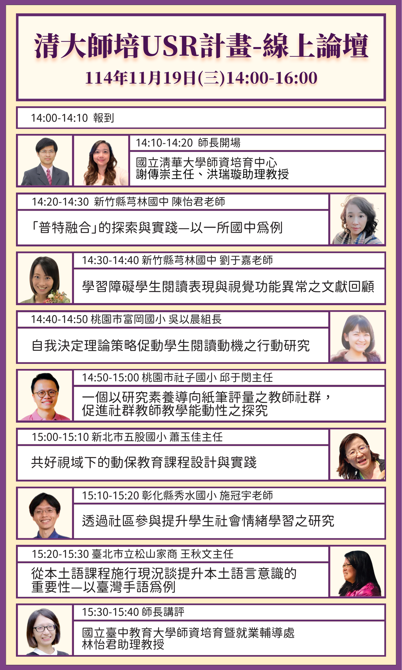 | 二、 | 國立清華大學為推廣該校USR計畫之研究成果,爰辦理線上論壇,邀請參與計畫教師分享教學實踐與行動研究經驗,以促進跨域交流與專業對話。 |
