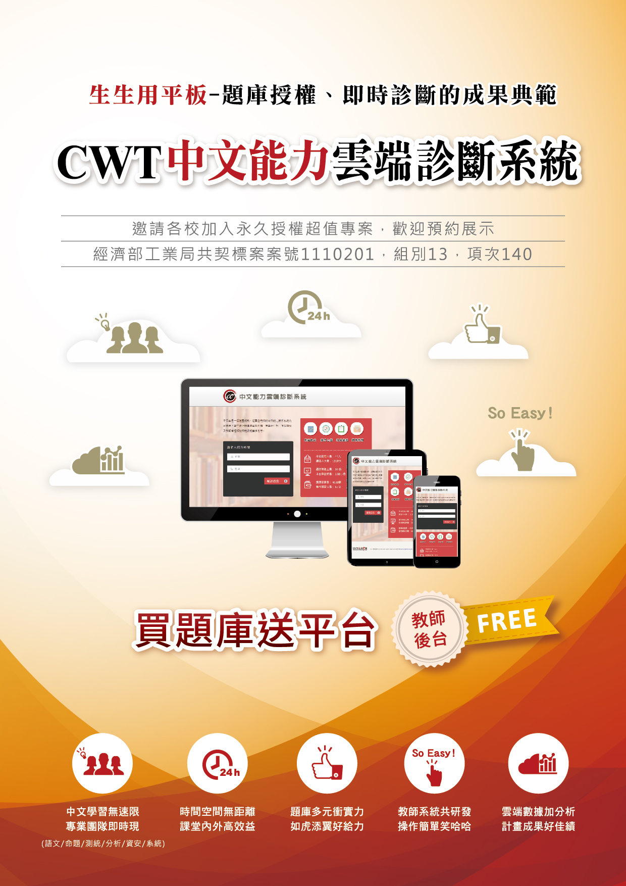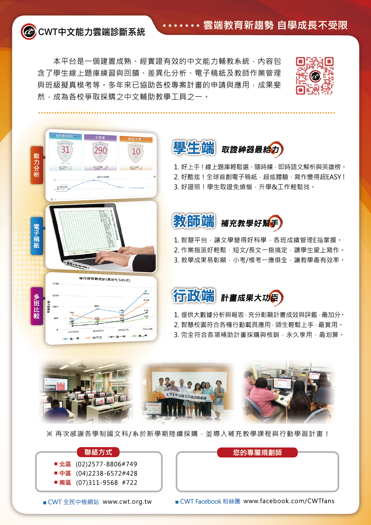 二、「CWT中文能力雲端診斷系統」提供高中職學生可自學的語文素養化題庫,教師可用以進行多元評量、作業派發與管理,其獨創的作文批閱模組、教育統計模組深受好評,更能完整記錄、匯出個人「學習歷程」,凸顯學生能力亮點,彰顯教師教學成效,實證有助於提升學生中文力。