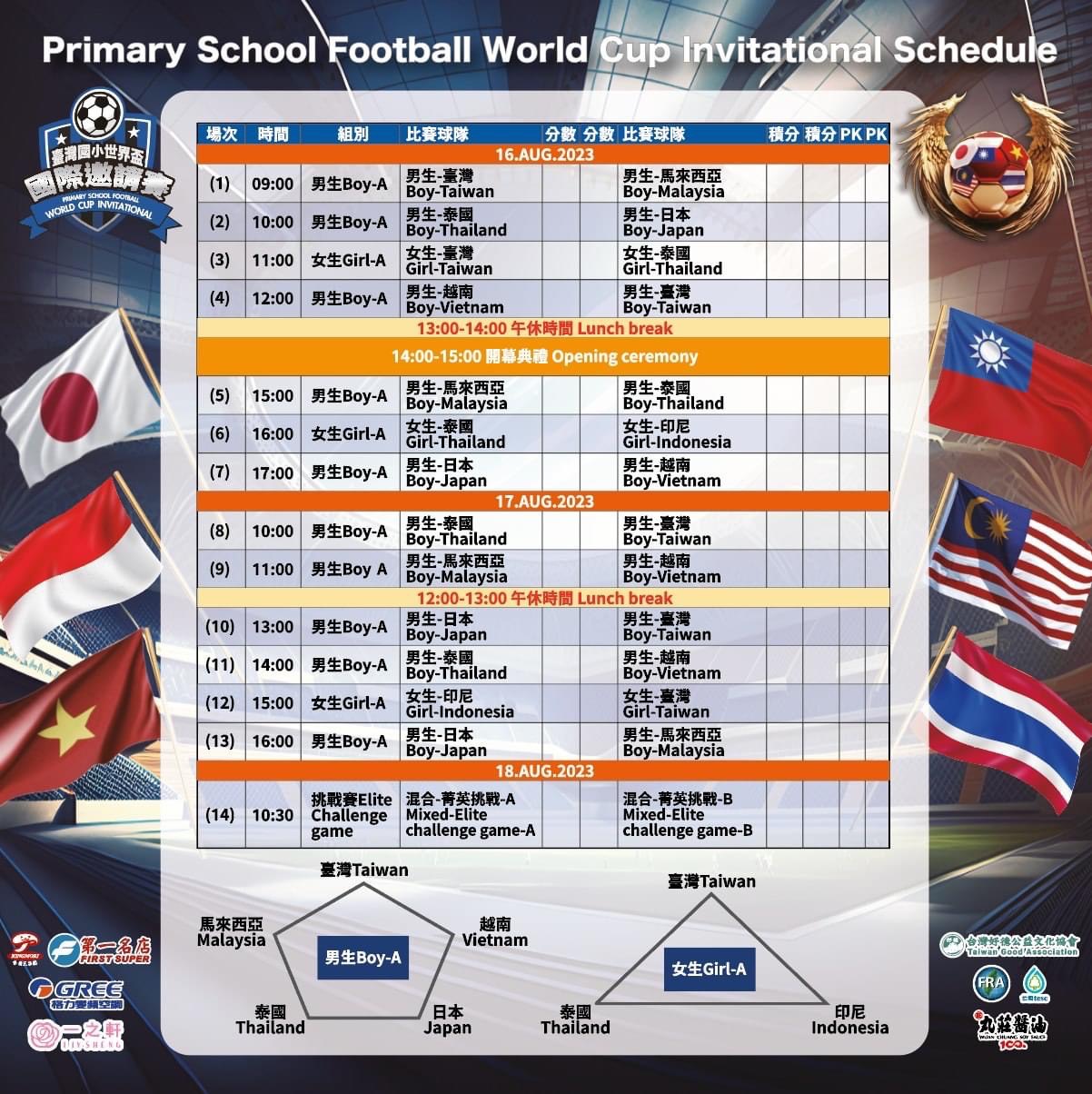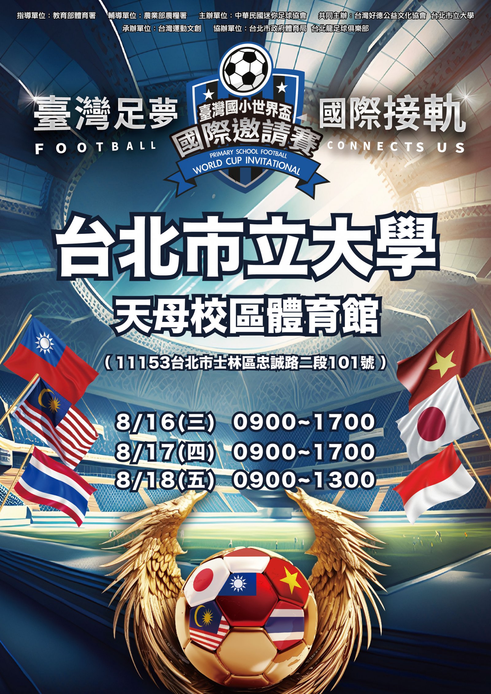 | 一、 | 為推展國民小學足球運動,提升國內國民小學足球水準與視野,與國際接軌增加臺灣足球國際能見度、增進國際友誼,本會將於112年08月16日至112年08月18日假臺北市立大學天母校區體育館舉辦旨揭活動,宣傳海報及賽程圖如附件一、二,歡迎各校一同來參與觀賽。 |