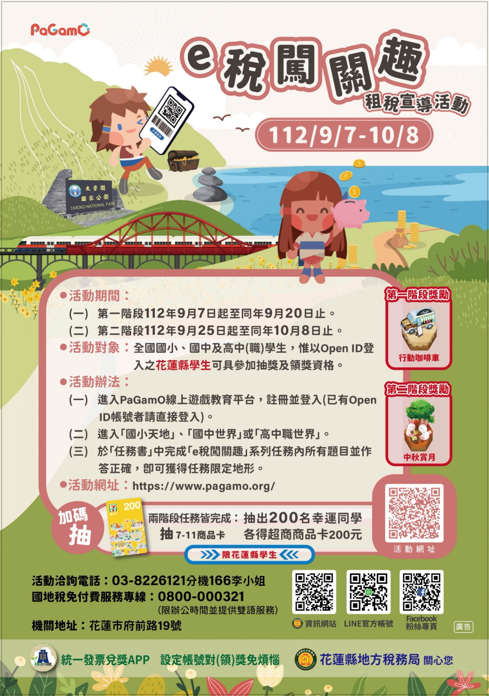 主旨: 為建立正確租稅知識與普及租稅教育,即日起至本(112)年10月8日(星期日)止分二階段,舉辦112年「e稅闖關趣」租稅宣導活動,請貴校協助於網站刊登活動訊息及連結,並鼓勵及帶領學生踴躍參與,請查照。