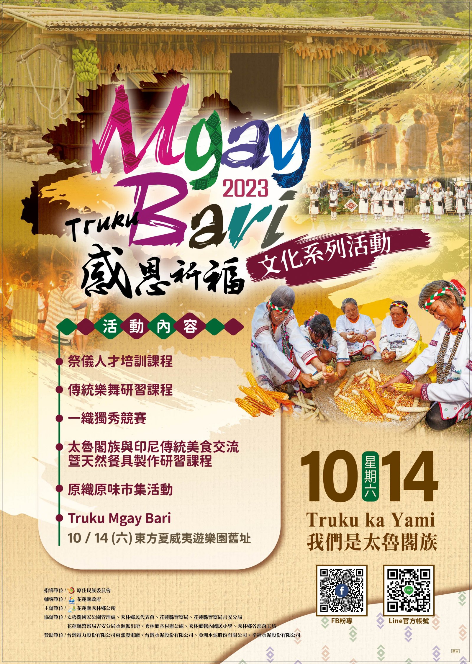 | 四、 | 活動內容有感恩祈福儀式、傳統舞蹈競賽、百人木琴展演、傳統歌謠傳唱展演、傳統競技競賽、傳統竹屋搭建、Truku文化體驗及傳統手工藝展示售等,相關活動訊息,請逕至本所資訊服務網站(http://www.shlin.gov.tw/)查詢,或電洽本所文觀課03-8612116分機705王小姐。 |