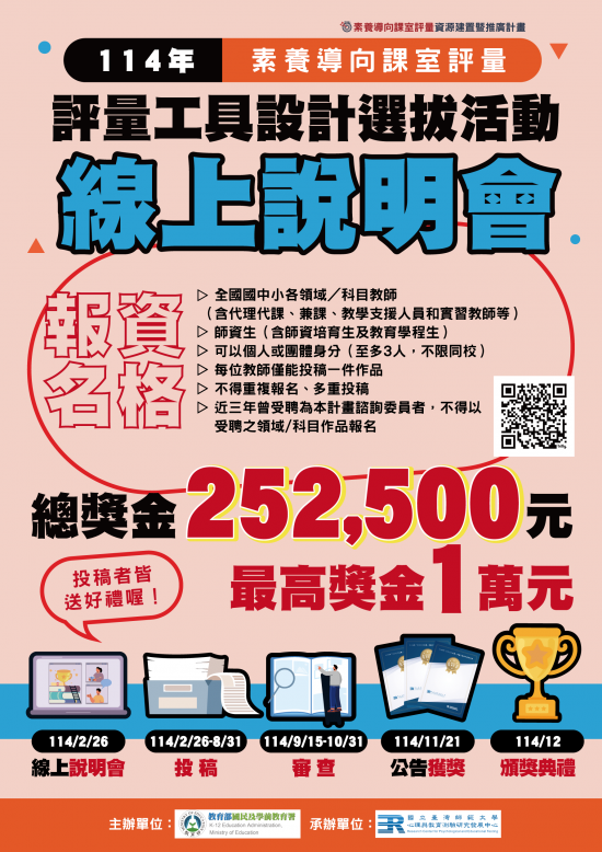| 三、 | 投稿期間自 114 年 2 月 26 日至 8 月 31 日止。實施辦法如附件 1 ,另提供海報電子檔(如附件 2),歡迎各國中小、教育學院、師培中心及系所張貼公布欄。 |