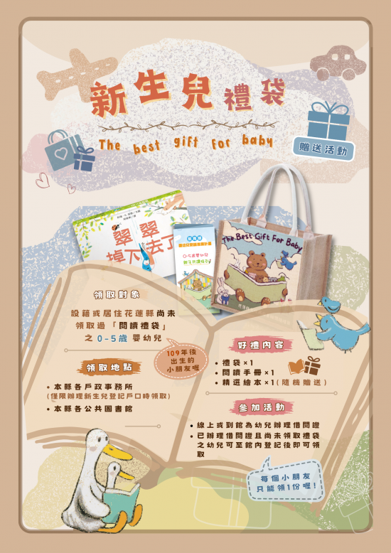 | 1、 | 新生兒辦理登記時同時辦理閱覽證即可領取 1 份「閱讀禮袋」。 |