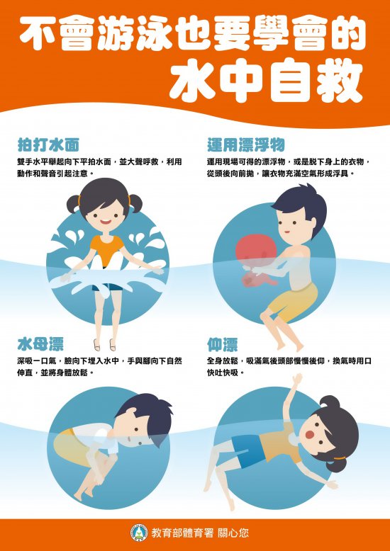 二、教育部體育署提供「不會游泳也要學會的水中自救」4 招式,請加強宣導: