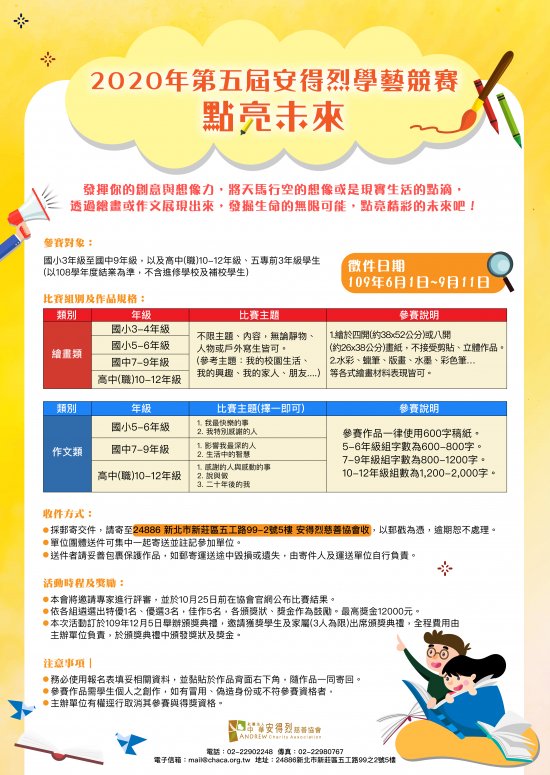 一、 為增進台灣偏鄉、(中)低收入戶、清寒弱勢家庭兒少閱讀寫作及美術繪畫的興趣與能力,特別舉辦「作文、繪畫」之學藝競賽活動,以激發學生在文字與繪畫藝術方面的想像力與創作力,鼓勵有志於相關領域創作的學生發揮才華。