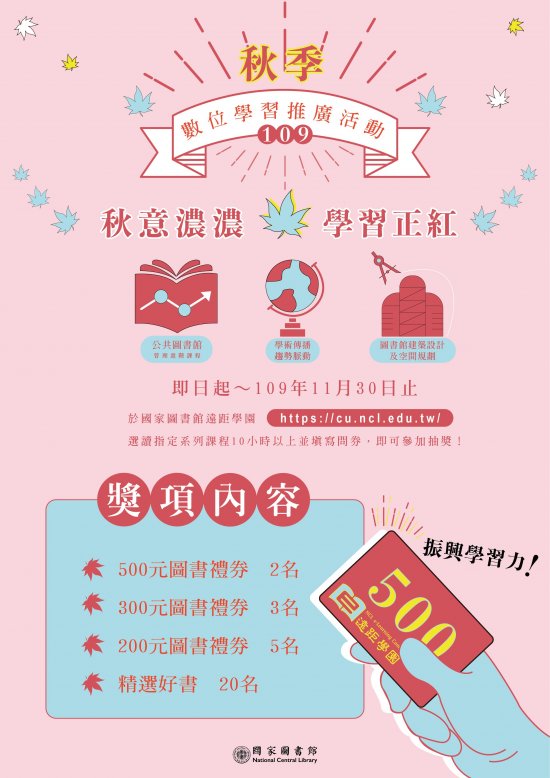 二、 為增進各類型圖書館從業人員及其他公教人員之專業知能,規劃辦理旨揭活動,於國家圖書館遠距學園數位學習平臺( https://cu.ncl.edu.tw/)開設「公共圖書館管理進階課程」、「圖書館建築設計及空間規劃」及「學術傳播趨勢脈動」等系列課程,即日起至 109 年 11 月 30 日止選讀並完成數位課程學習達 10 小時者,即可參加抽獎活動。
