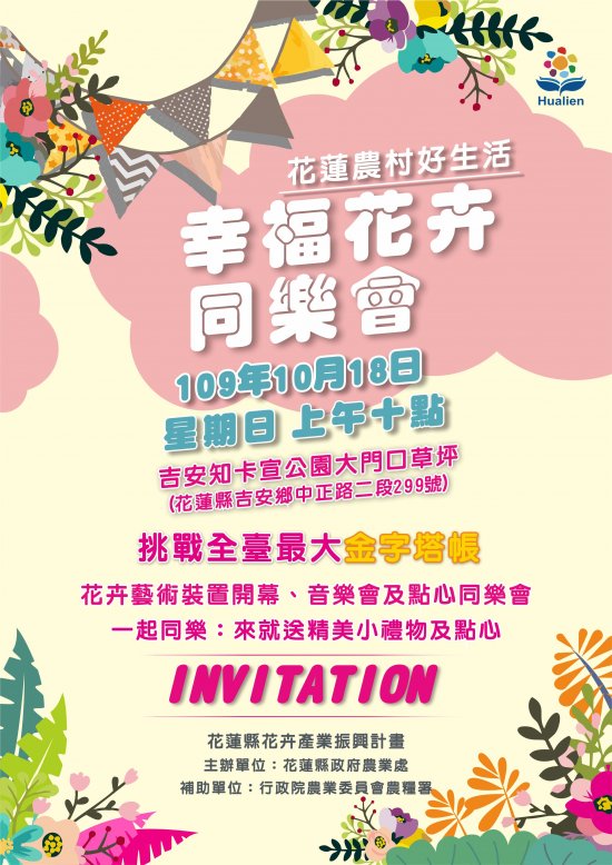 二、花卉藝術裝置展示期間為期一個月,在本(10)月 18 日 10 點至 12 點辦理開幕活動,現場參加可獲得精美禮物及點心一份,歡迎大朋友小朋友一同前來欣賞花卉裝置藝術打卡拍照,支持在地花卉產業。詳情請搜尋 FB 粉絲團「花蓮農村好生活」。