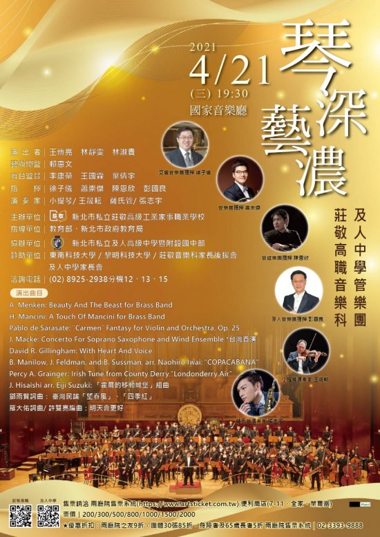 說明: 一、新北市私立及人高級中學管樂團,定 110 年 4 月 21 日於國家音樂廳舉辦「琴深藝濃」音樂會,檢送活動海報電子檔,請惠予公告。 二、本校此次辦理音樂會活動,備有公關票,每校限取五張,歡迎有意者統一由校方索取。 三、為遵守國家表演藝術中心防疫規定,索票者煩請提供姓名及聯絡方式。 四、活動相關事宜請參閱海報內容。