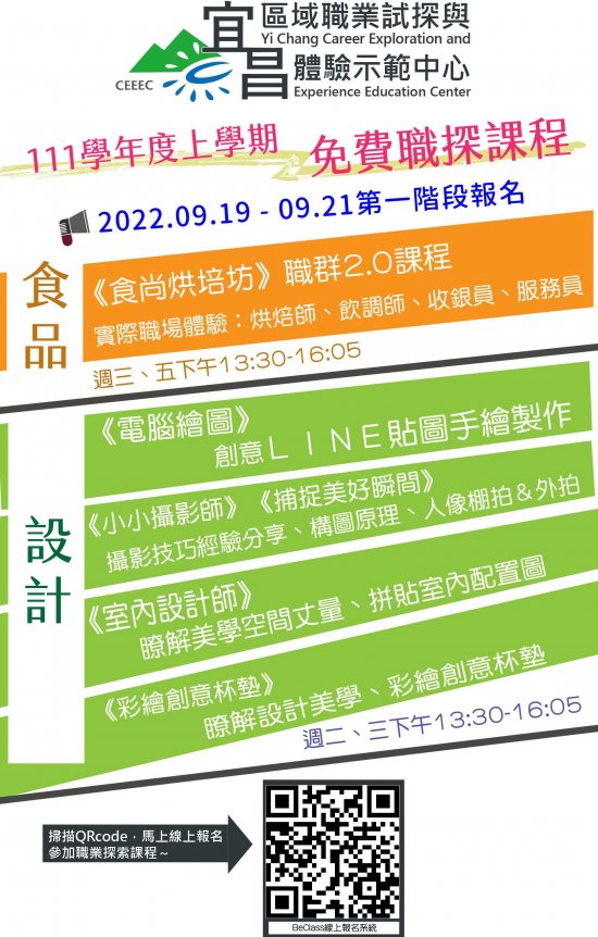 二、第一階段報名時間自 111 年 9 月 19 日 9 時起至 111 年 9 月 21 日 17 時止,請逕自前往宜昌國中校網公告中點選報名連結,或至 BeClasseClass 線上報名系統搜尋「宜昌國中」 ( https://bit.ly/3KUgxBv )進行報名作業,錄取名單將於 111 年 9 月 23 日公布於宜昌國中校網公告中。