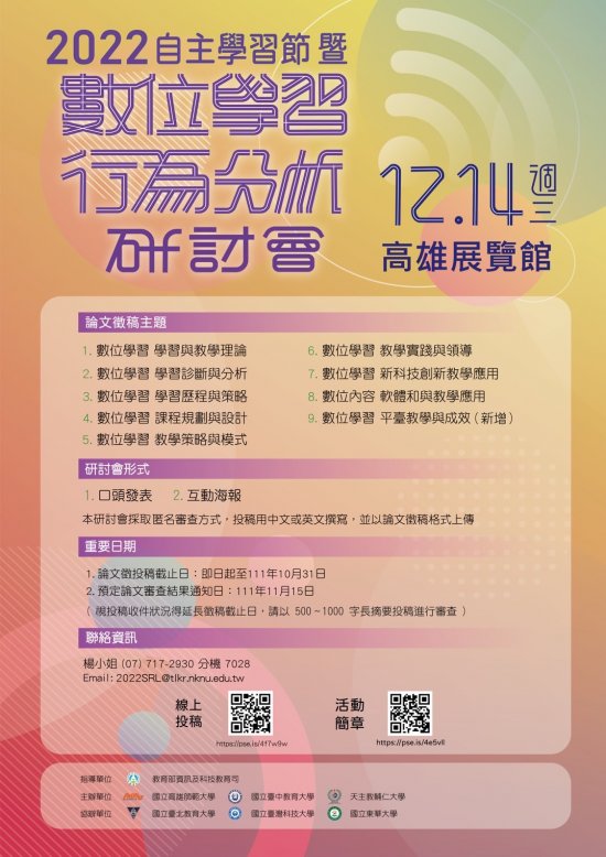 一、依據教育部 111 年 10 月 13 日臺教資(三)字第 1110099626 號函及國立高雄師範大學 111 年 10 月 7 日高師大科環字第 1111007849 號函辦理。 二、本次更新重點如下: (一)徵稿主題新增「數位學習平臺教學與成效」。 (二)徵稿摘要格式修正為以 500 至 1000 字摘要投稿。 三、本案聯絡人:楊小姐(07)717-2930 分機 7028 , Email : 2022SRL@tlkr.nknu.edu.tw 。