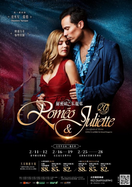 (三)表演介紹:改編自英國文豪莎士比亞的經典作品「羅密歐與茱麗葉」,是當今唯一用「音樂劇」及「法文」形式來呈現這不朽愛情故事的創作。經典故事、融合流行及古典風格的動人歌曲,再加上高達 2.5 億製作費的華麗精緻服裝場景,於 2001 年巴黎首演後,歷經多年演出已被翻譯超過 10 多種語言版本,莎翁經典再次造成全球轟動!至今已累積全球超過 650 萬人次觀賞紀錄,奪得「21 世紀最偉大的流行音樂劇」之美讚。不僅在戲劇成就上佳評如潮,劇中歌曲更登上各國排行榜冠軍,創下百萬張銷售紀錄,是您不容錯過的叫好叫座經典法文音樂劇。