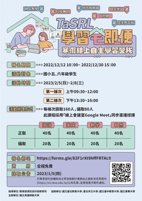 八、錄取公告:於教育部科技輔助自主學習推動計畫網站之最新消息頁面內( https://srl.ntue.edu.tw )公布名單,並寄發電子郵件通知。