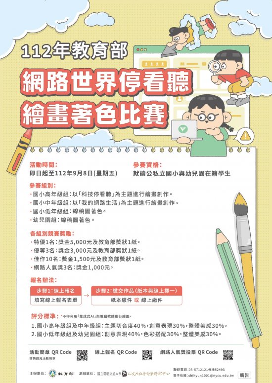 二、為增加國民小學(以下簡稱國小)與幼兒園學生對於資訊素養之認知及興趣,並推廣符合法規與道德之資訊網路使用方式,教育部委託國立陽明交通大學辦理旨揭比賽,活動說明如下:
