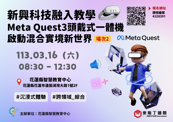 二、旨揭研習為增進本縣國民中小學數位學習能力,提升教師運用數位科技及資源實施教學之能力,透過 Meta Quest3 頭戴式虛擬實境一體機實際操作混合實境模式並發展沉浸式體感教學內容,研習資訊如下(共辦理 2 場次;第 1 場次為基礎操作及混合實境體驗、第 2 場次為混合實境體驗及相關教學應用。):