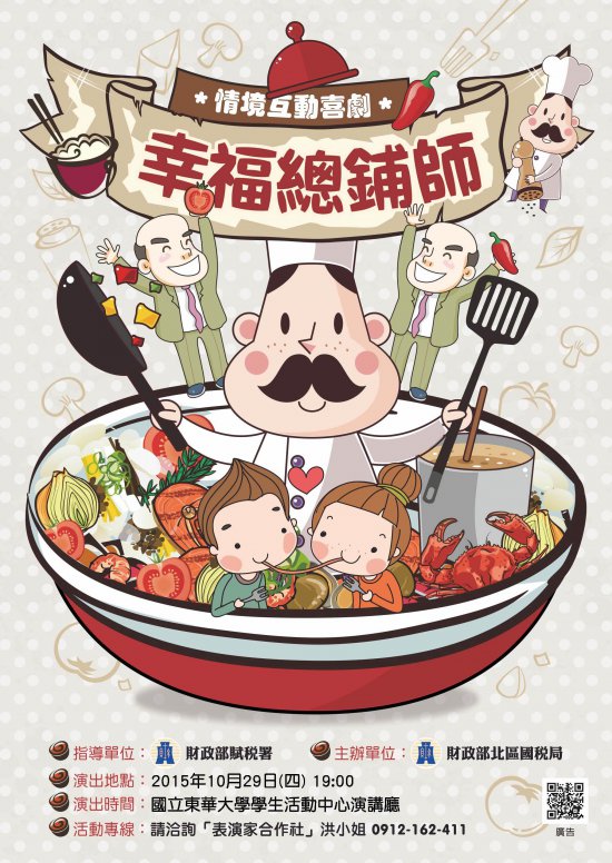 一、「幸福總鋪師」演出資訊如下: (一)演出時間: 2015 年 10 月 29 日(四)19 時 00 分 (二)演出地點:東華大學學生活動中心演講廳 二、「藝啟合作」演出資訊如下: (一)演出時間: 2015 年 10 月 30 日(五)19 時 00 分 (二)演出地點:東華大學學生活動中心演講廳 三、以上活動不需報名、免費入場,歡迎自由入座。