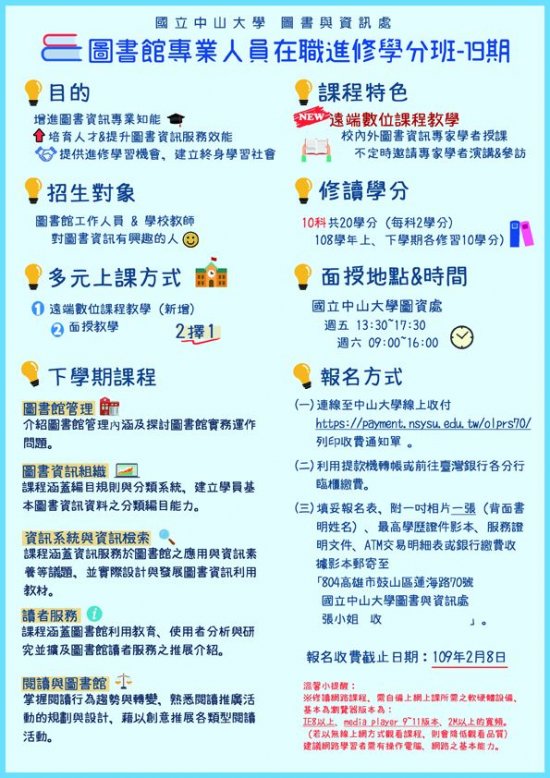 | 主旨: | 函轉國立中山大學圖書與資訊處辦理「第19期圖書館專業人員在職進修學分班」第二階段招生簡章(本階段新增「遠端數位課程」),請貴校鼓勵所屬人員報名進修,予以公假參加課程,請查照。 |