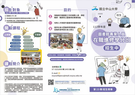 | 二、 | 為健全圖書館組織之經營發展,政府訂定各級圖書館設立及營運基準,配置專業人員為其中重要的一環;國立中山大學圖書與資訊處特辦理學分班提供教育人員進修之機會,以提昇圖書館專業人力素質與資訊素養,迄今已開辦22期,結訓學員逾 757位。 |