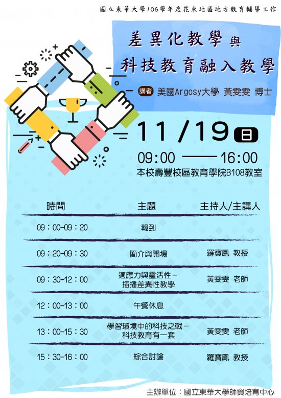 (二) 差異化教學與科技教育融入工作坊:106年11月19日(星期日)9:00~16:00 。