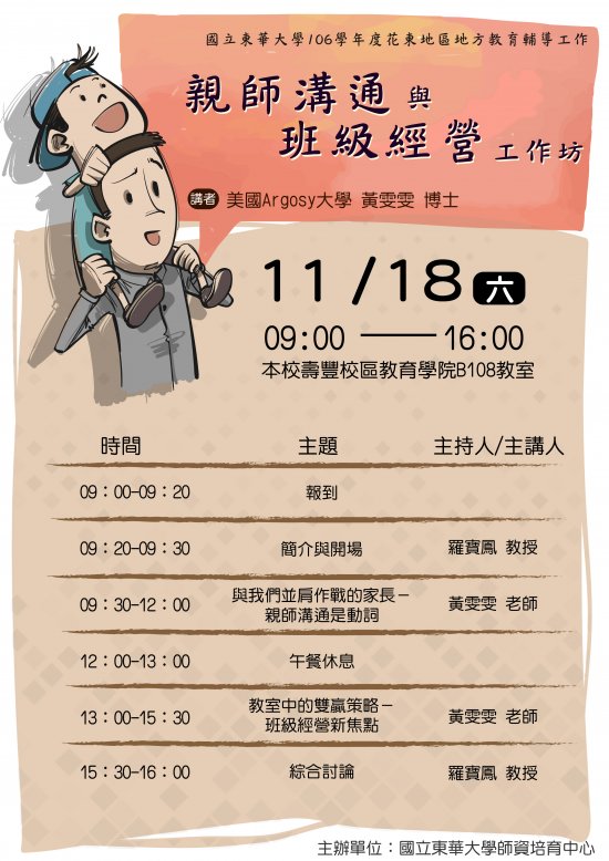 (一) 親師溝通與班級經營工作坊:106年11月18日(星期六)9:00~16:00。