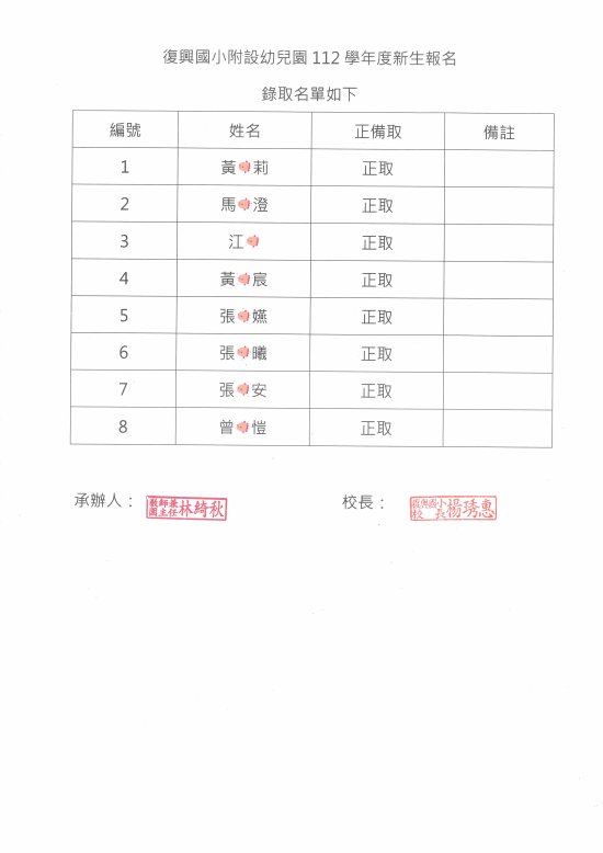 復興國小附設幼兒園112學年度新生錄取名單