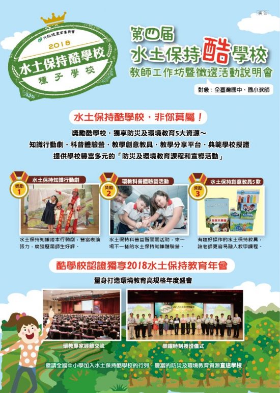 凡入選「第四屆水土保持酷學校」之學校,水土保持局將挹注相關教育資源,包含水土保持知識行動劇1場、環教科普體驗營活動1場及水土保持創意教具等。檢附「第四屆水土保持酷學校-種子學校推廣計畫」計畫書及活動DM各1份。