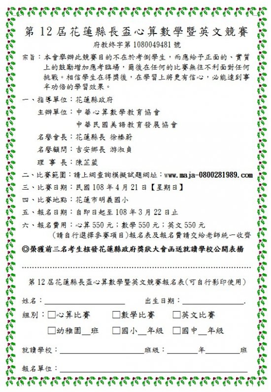 第十二屆[縣長盃]心算、英文暨數學競賽資訊