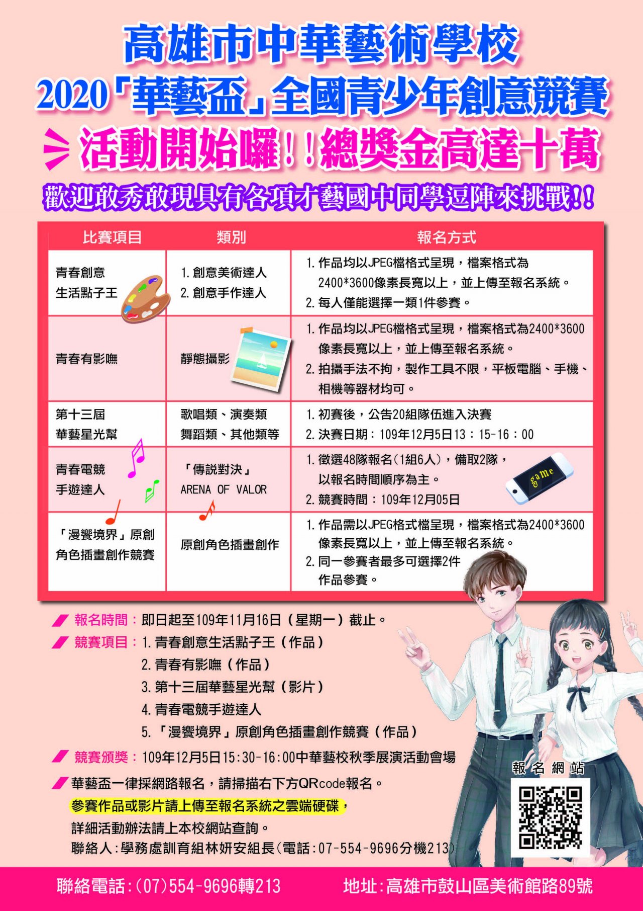 (四)競賽項目:1、青春創意生活點子王(作品) 2、青春有影嘸(作品) 3、第十三屆華藝星光幫(影片) 4、青春電競手遊達人 5、「漫饗境界」原創角色插畫創作競賽