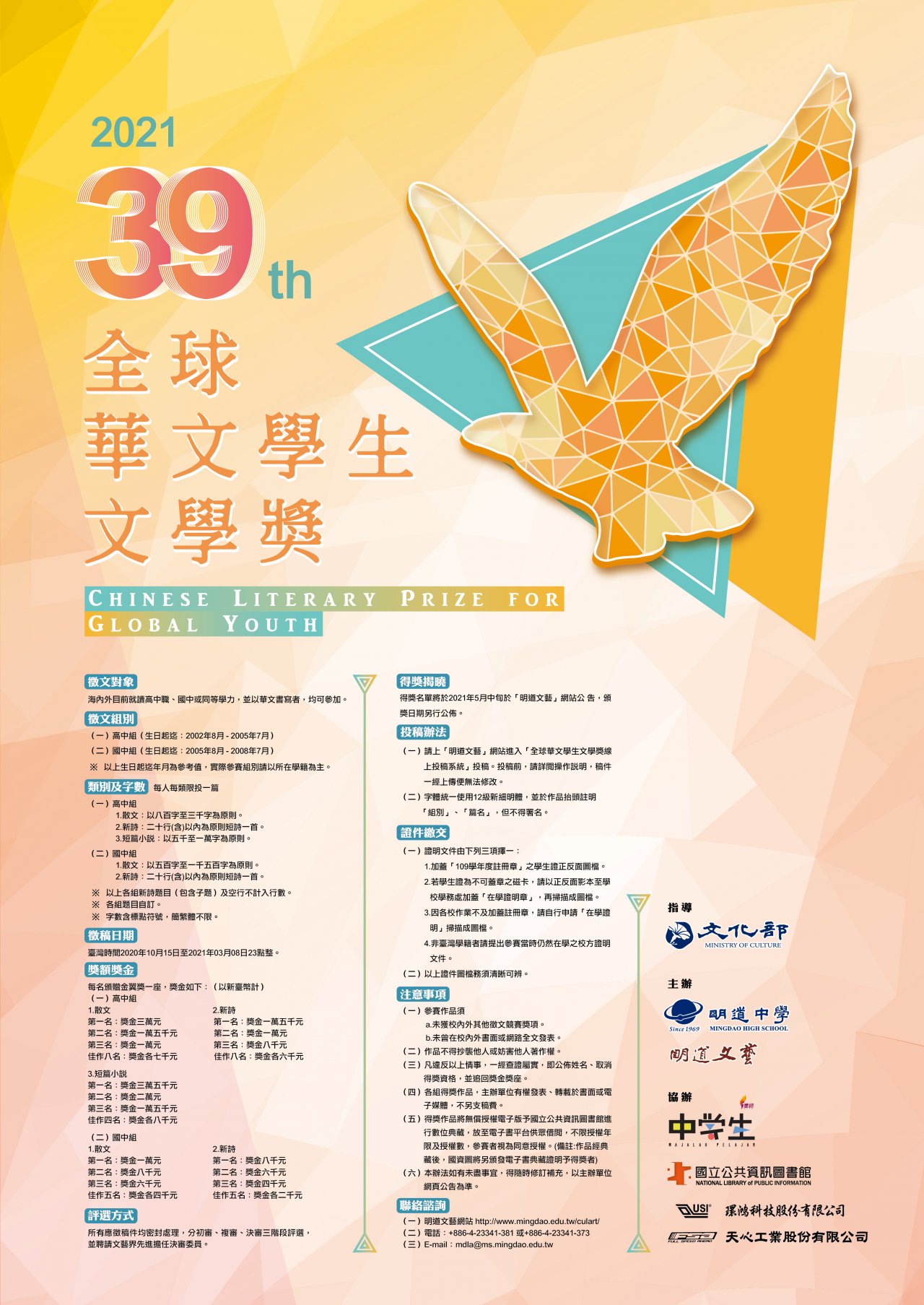 一、 「第 39 屆全球華文學生文學獎」徵文對象為海內外目前就讀高中職、國中或同等學力,並以華文書寫者,均可參加。