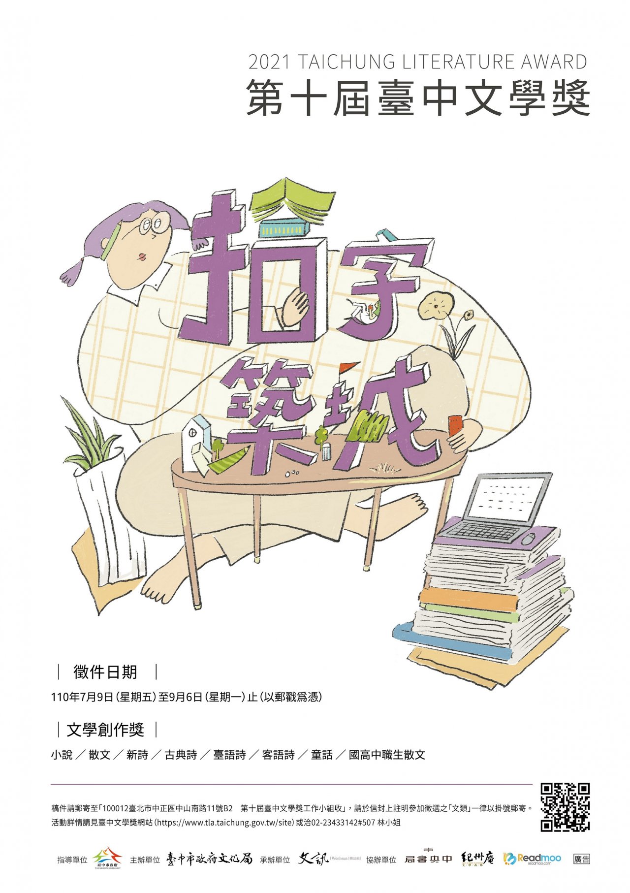 四、 紙本宣傳海報及簡章後續將另寄達,館舍開放後,敬請協助張貼、擺放及分發所屬單位。相關活動詳情請至臺中市政府文化局(https://www.culture.taichung.gov.tw 或臺中文學獎網站( https://www.tla.taichung.gov.tw/ )查詢,活動洽詢專線 02-23433142*507 林小姐。