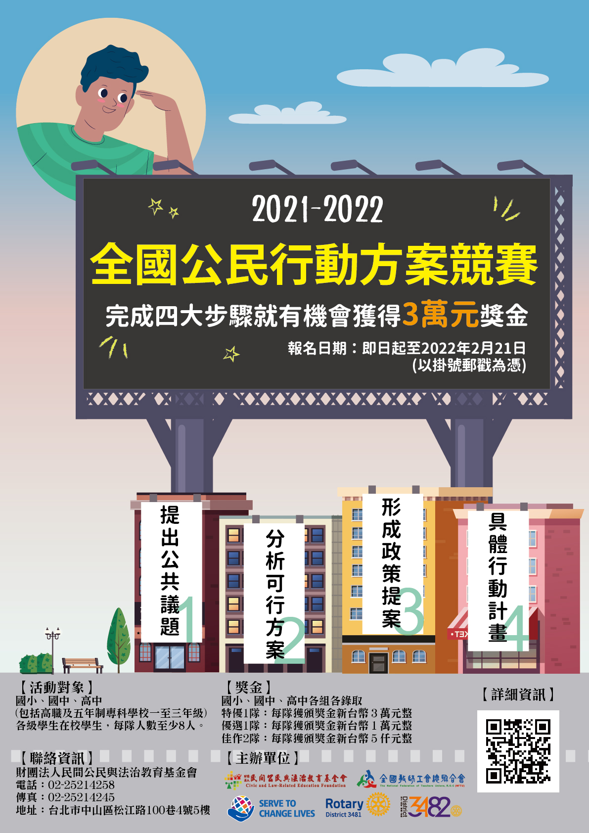 財團法人民間公民與法治教育基金會辦理「2021-2022 年全 國公民行動方案競賽」,鼓勵全國各級學校,強化批判思 辨及行動力。該會推廣《公民行動方案》課程書籍中行動 方案四大步驟,鼓勵師生透過競賽,實作公民行動方案, 培育下一代公民素養。旨揭活動即日起開始受理報名,截 止時間: 2022 年 2 月 21 日(一)前以郵戳為憑。採快遞送件 者,最晚交寄日需在報名截止日期前(有收據足以佐證)。 活動詳細請參閱網址 https://www.lre.org.tw/news /663 ,活動資料詳如附件。