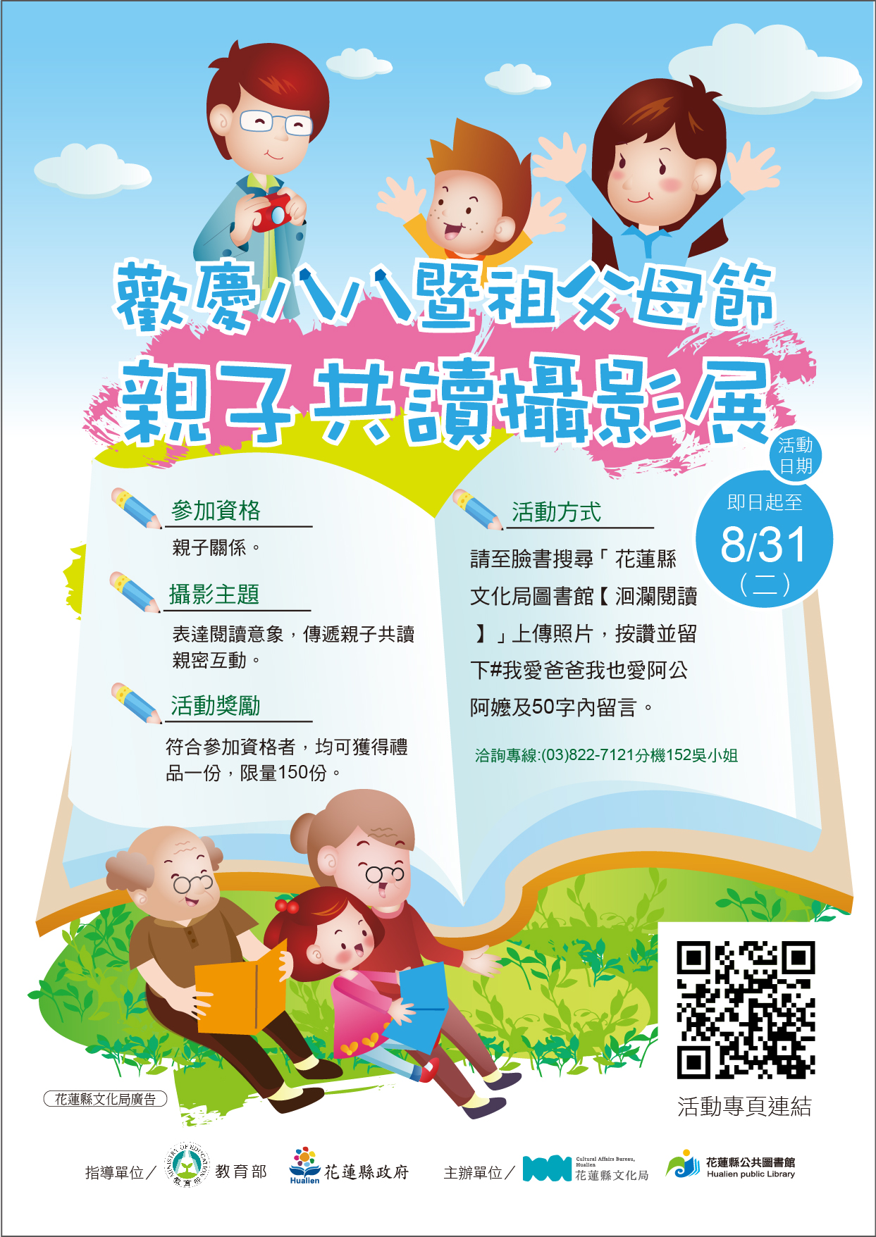 一、旨揭活動相關事項如下: (一)即日起至 110 年 8 月 31 日(二)請至臉書搜尋「花蓮縣文化 局圖書館【洄瀾閱讀】」上傳照片,按讚並留下#我愛爸 爸我也愛阿公阿嬤及 50 字內留言。 (二)參加者請提供參加照片【照片規格並限 1,000 萬畫素 (3648x2736)以上】辦理歡慶八八暨祖父母節親子共讀攝 影展,獎勵符合參加資格者,均可獲得禮品一份,限量 150 份。 二、活動網址: https://www.facebook.com/hua.library 。 三、承辦人聯絡資訊:圖書資訊科吳美姈 03-8227121 分機 152
