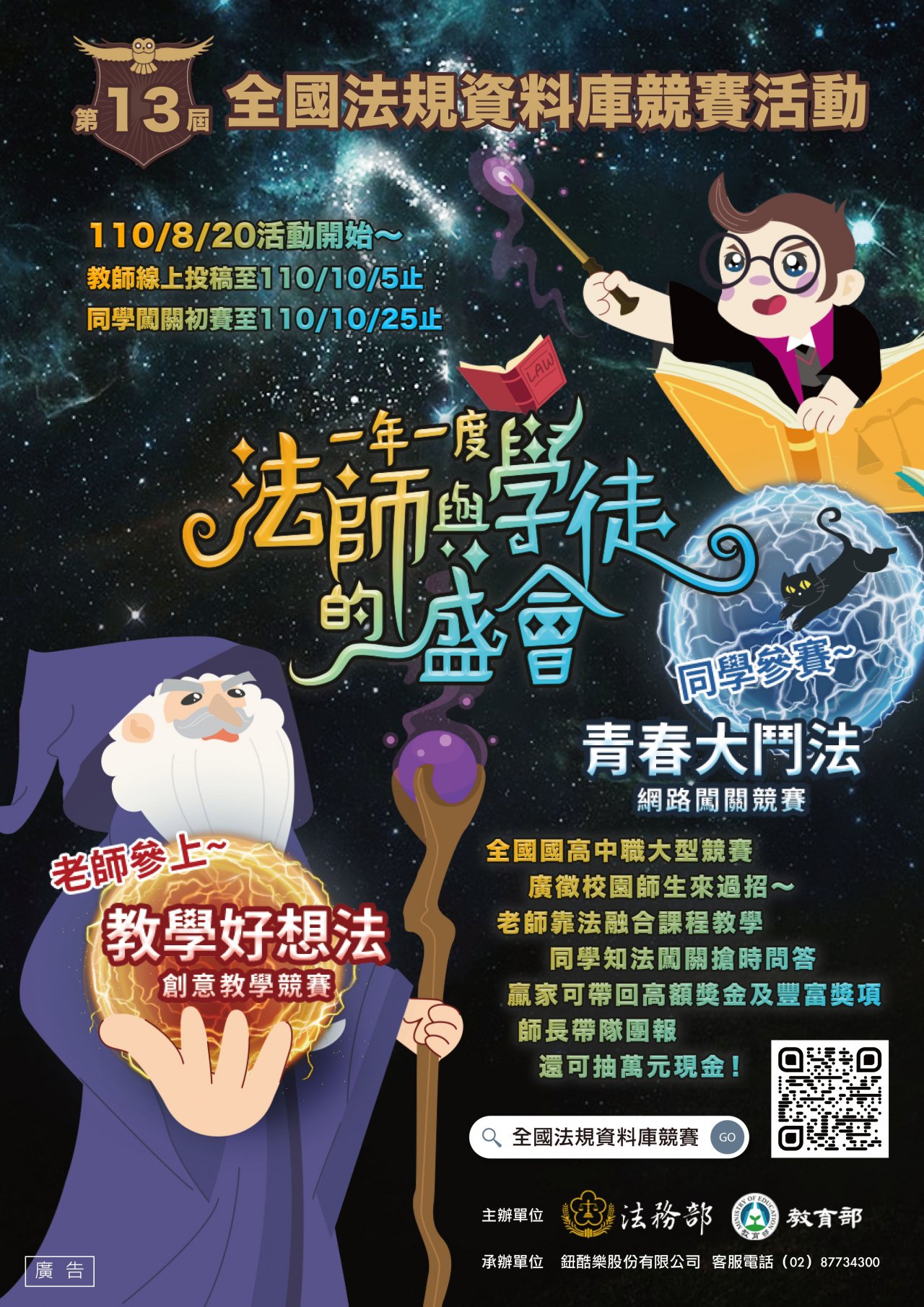 (一)法規知識王網路闖關競賽: 1、活動對象:全國國中、高中職(含五年制專科學校一、二、三年級)學生(分國中學生組及高中職學生 組)。 2、活動方式:採網路初賽及決賽兩階段競賽。 3、網路初賽:自 110 年 8 月 20 日起至 110 年 10 月 25 日止。 (二)全國法規資料庫創意教學競賽: 1、活動對象:全國國中、高中職(含五年制專科學校) 教師(分國中組及高中職組)。 2、活動方式:本屆不設教案主題,參賽作品在符合「法 治教育議題」及「全國法規資料庫應用」之前提下, 融入「十二年國民基本教育課程綱要」相關教育領域 進行教案設計。 3、報名期間:自 110 年 8 月 20 日起至 110 年 10 月 5 日止