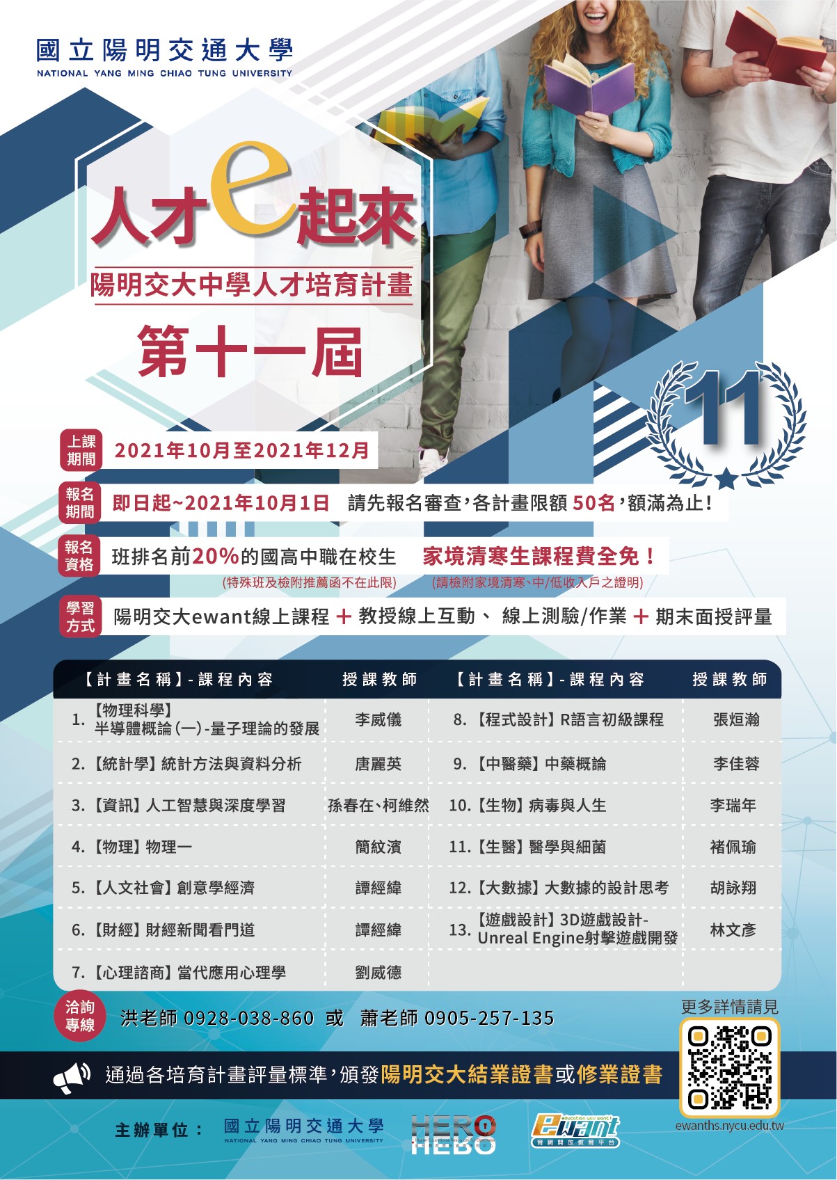 | 六、 | 開課日期: 2021 年 10 月至 2021 年 12 月,請詳閱計畫網站 https://ewanths.nycu.edu.tw 各計畫課程說明。 |